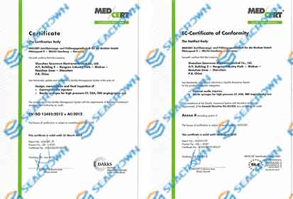 全面實施ISO9001和ISO13485質量管理體系,專業醫療器械公告機構德國勞氏MEDCERT現場考核,通過ISO 13485:2003質量管理體系認證,產品獲得CE認證證書。