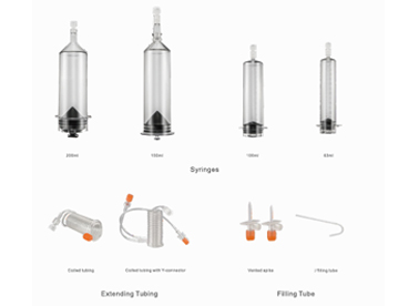本品有高壓注射器專用針筒、高壓連接管、吸藥管、靜脈輸液管等耗材產(chǎn)品。針筒及附件套包由高壓注射器專用針筒、連接管路、接頭組成。本產(chǎn)品是高壓注射器配套使用的承載造影劑的一次性使用注射容器,適用于CT增強(qiáng)掃描及CT血管成像檢查。