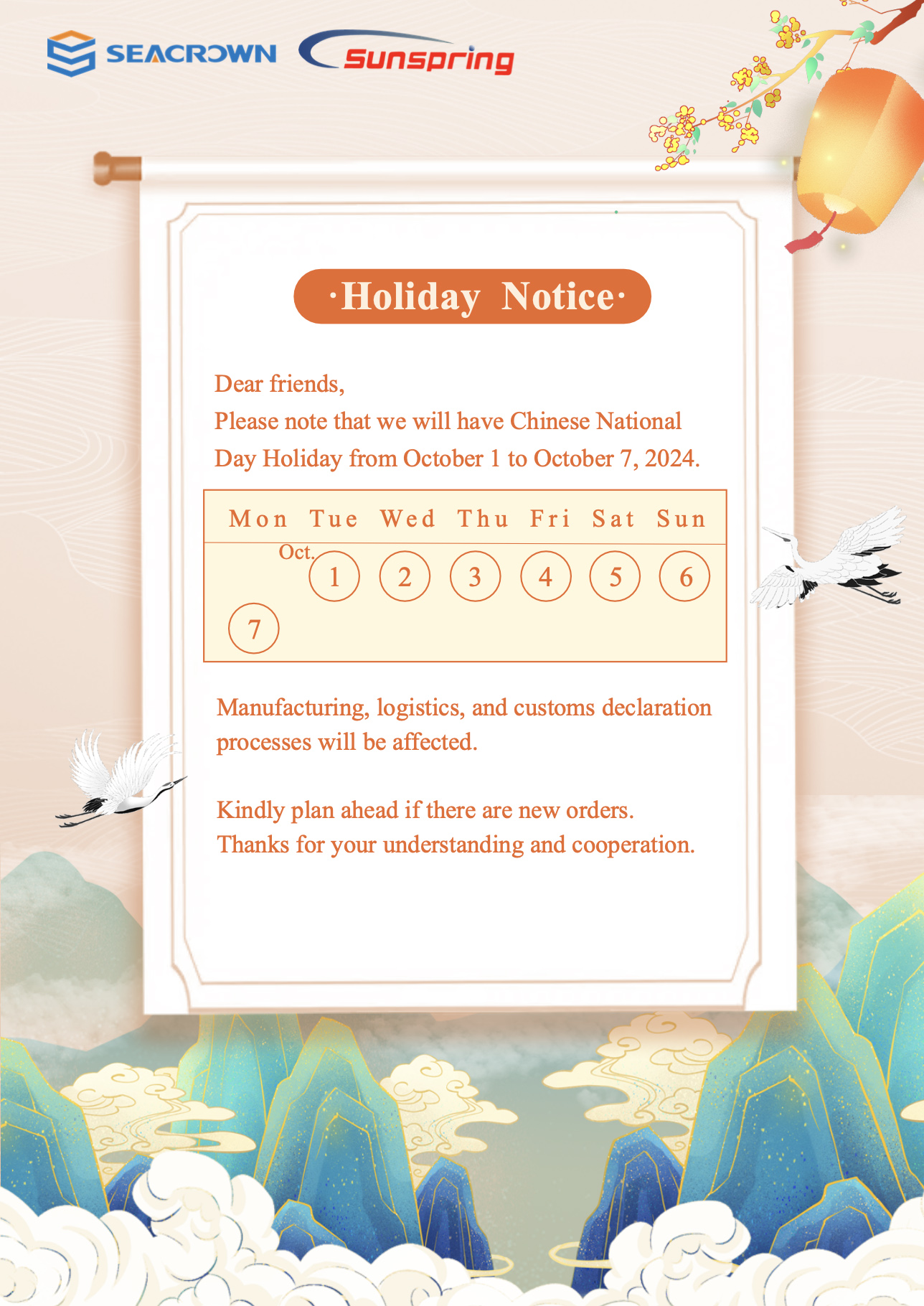 During this period, our manufacturing, delivery, logistics, and customs declaration processes will be affected. We kindly ask you to plan ahead and make necessary arrangements to prevent any potential delays.