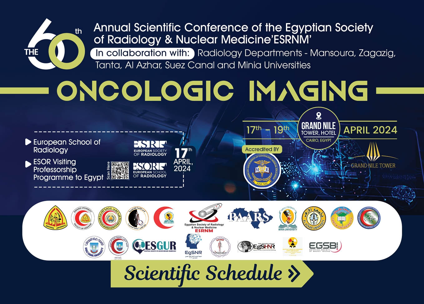 ESRNM is short for "Annual Scientific Conference of the Egyptian Society of Radiology & Nuclear Medicine", it focuses on advancements in the fields of Radiology and Nuclear Medicine. The activity includes knowledge sharing, networking of colleagues, continuing medical education, special programs, etc.